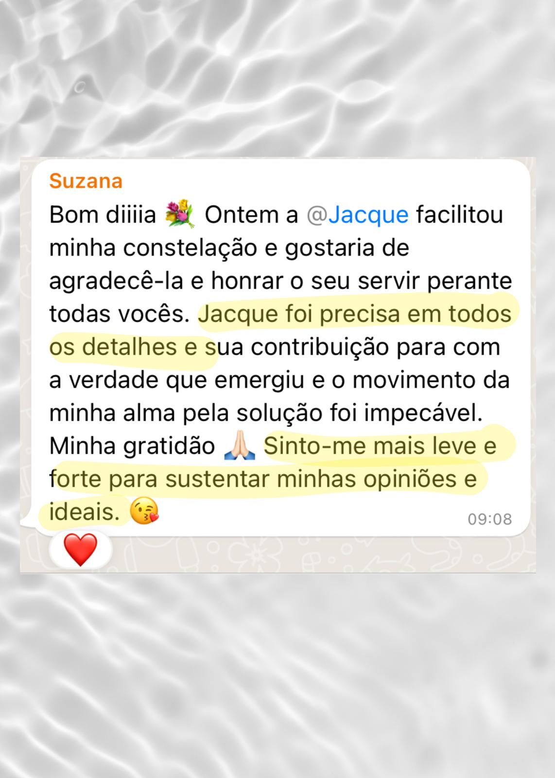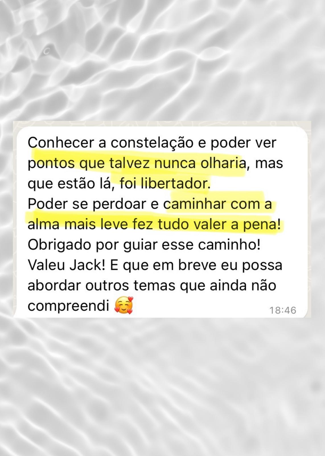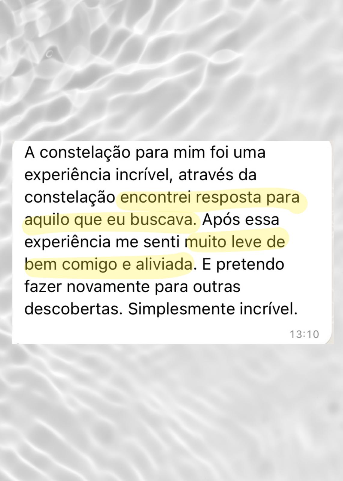 A Constelação na Água revela dinâmicas ocultas que influenciam sua vida, trazendo clareza e novas possibilidades. A imagem que surge no campo mostra o que sua mente não consegue ver, e com meu olhar treinado, te ajudo a enxergar e transformar esses padrões.
