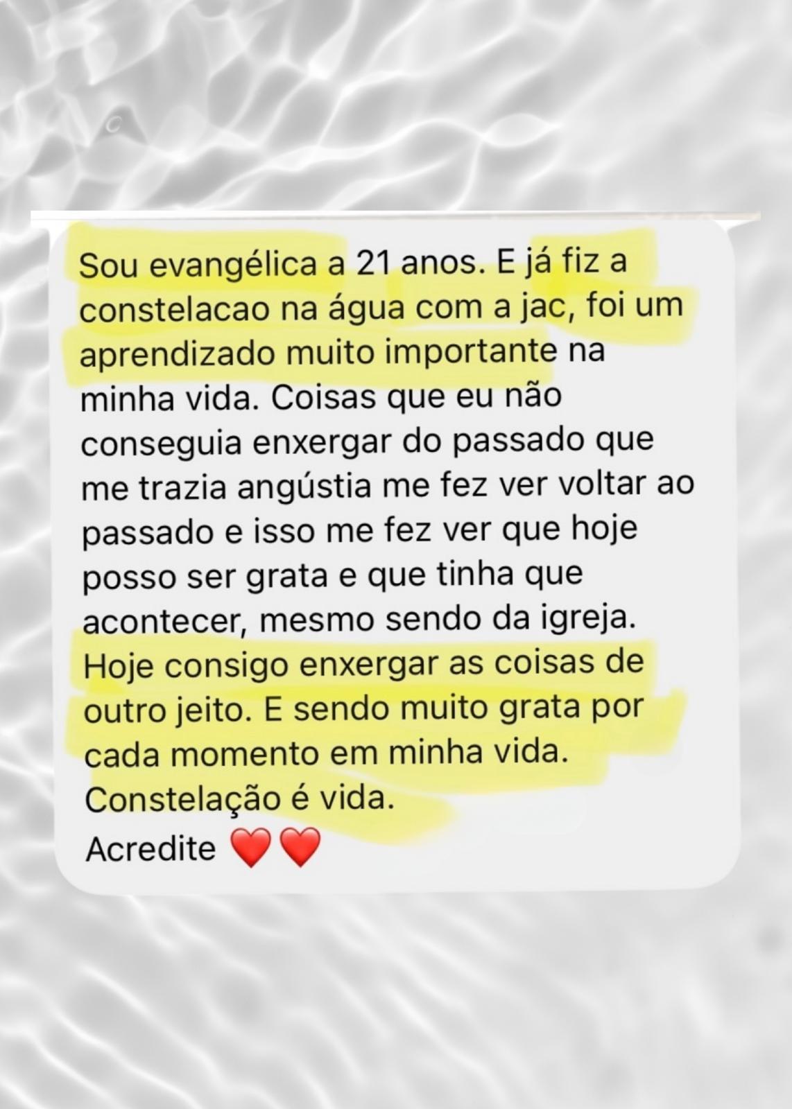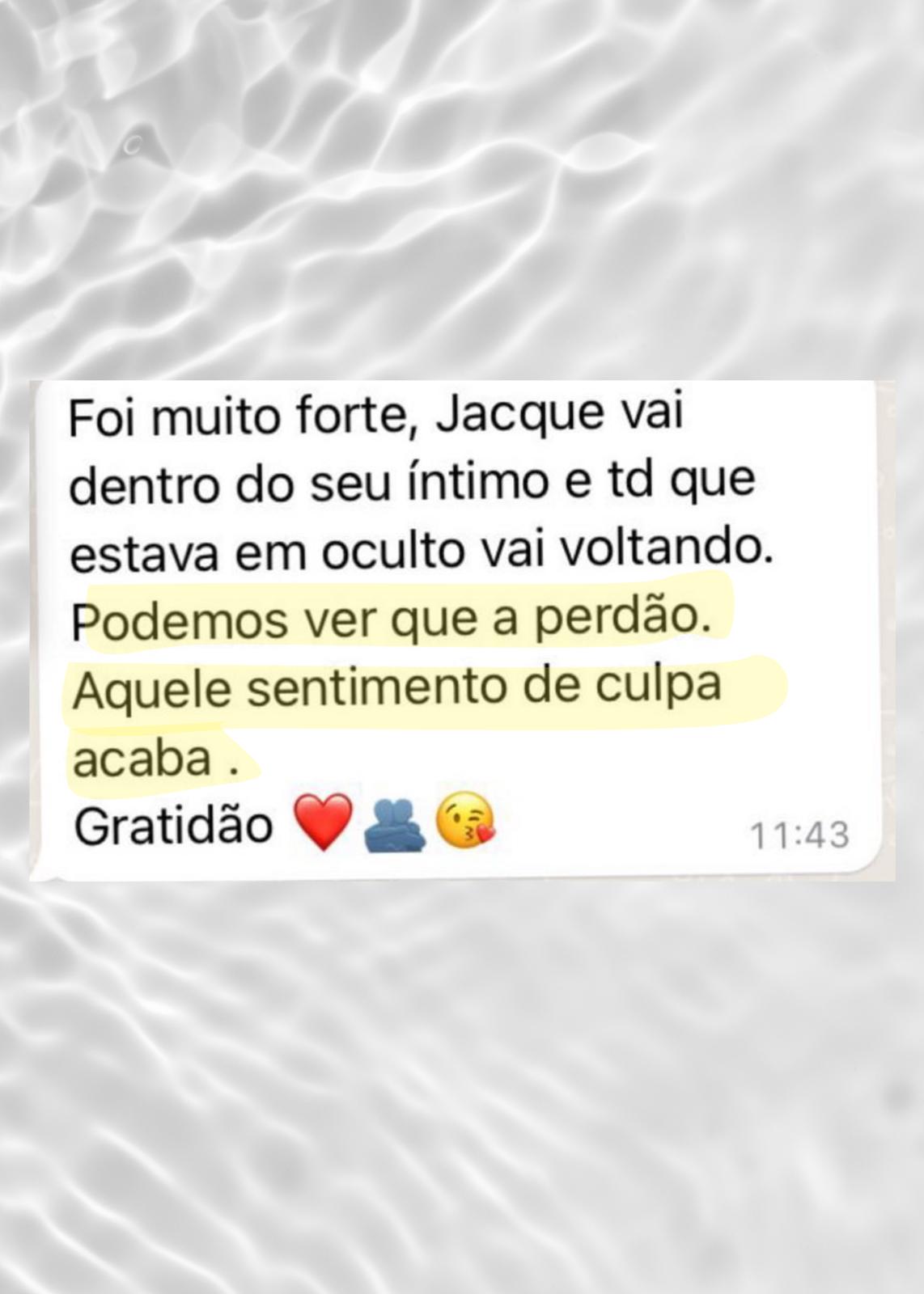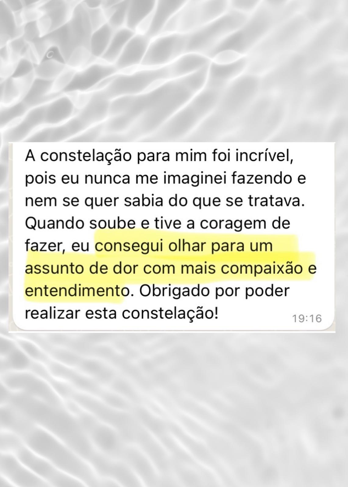 Com a técnica da Constelação na Água, trazemos à tona essas forças ocultas. A imagem que se forma no campo, seja com pessoas, bonecos ou na água, revela com clareza o que está por trás das suas dificuldades. E com meu olhar treinado, te ajudo a ver o que antes era invisível e a encontrar novos caminhos.